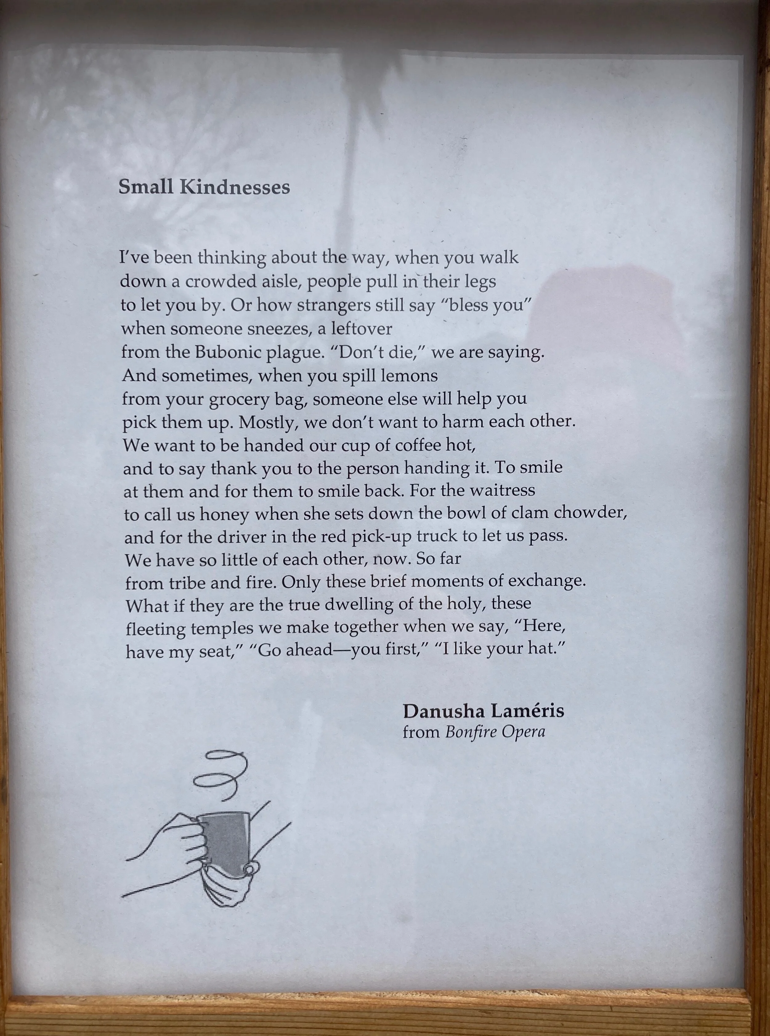 I don’t know much of Danusha Laméris’s work, but this poem keeps appearing along my path and I love it more each time I encounter it. It’s a poem so filled with pre-pandemic images that speaks so beautifully to what we need—and miss—in these pandemic times. Copies of it disappeared from the box quickly.