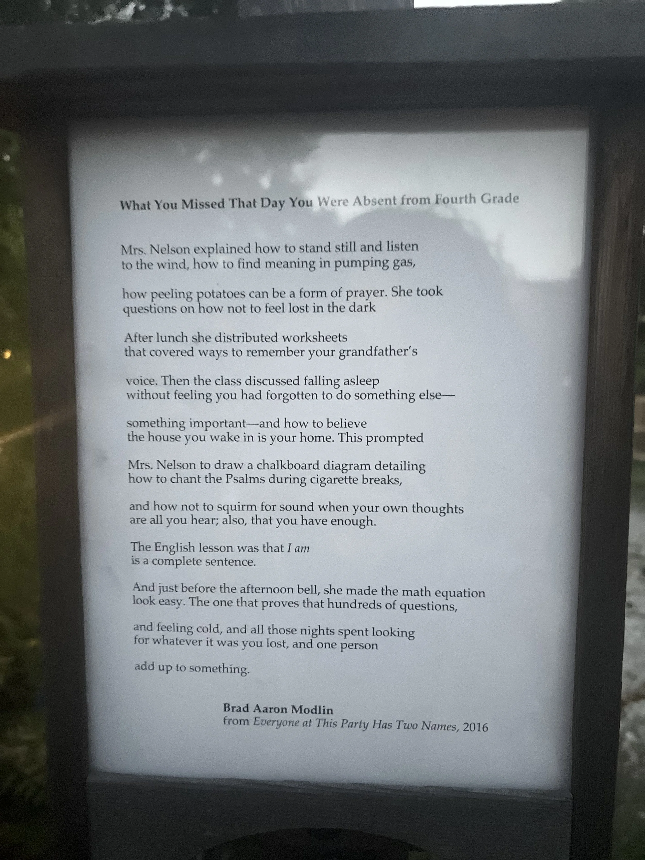 In honor of back-to-school time, I’ve shared this piece by Brad Aaron Modlin in the poetry box. At last weekend’s Write Together Saturday we let it guide us into free writes about the things we wished we’d learned and the things we had to teach ourselves. As the poem suggests, there is much to be learned in school, but sometimes the lessons the classroom can’t teach us are the ones that stay with us longest.