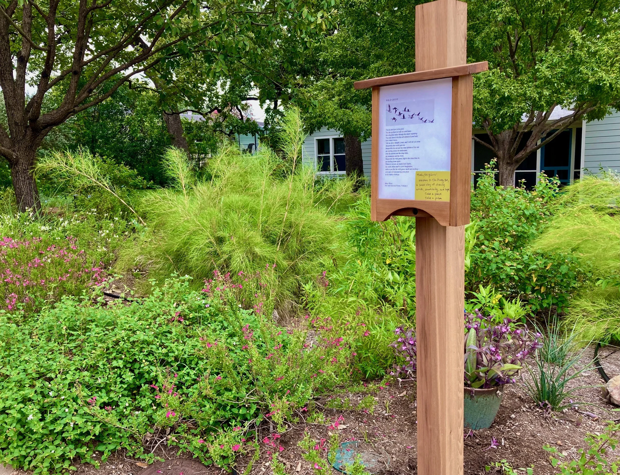 I put my first poem in the poetry box on this day in 2020, choosing Mary Oliver’s “Wild Geese,” because there is no better poem for starting an ongoing conversation with your neighbors through poetry. Today I put the poem back in the box, along with a note of thanks for four years of reading and sharing.