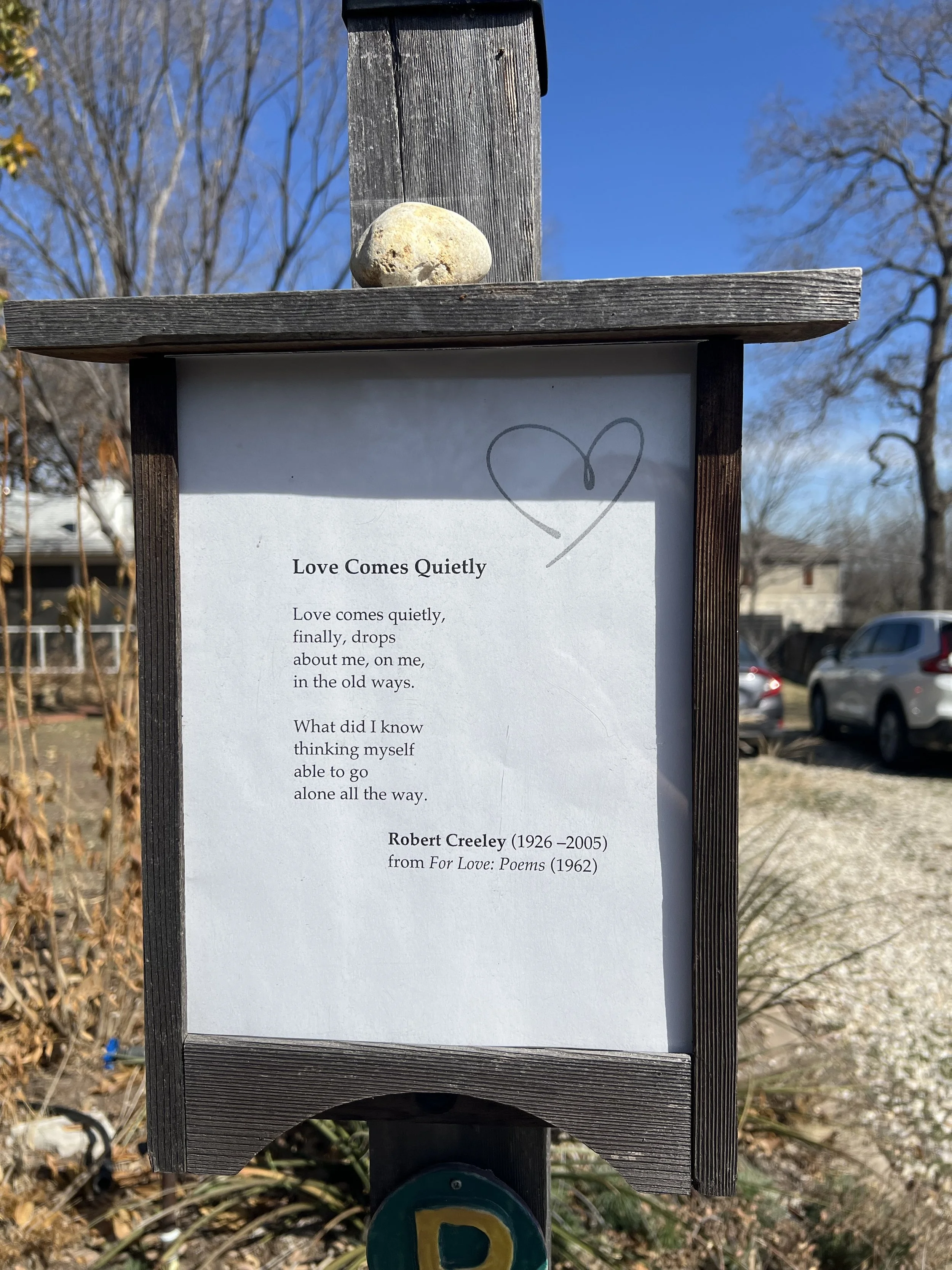 If your day has room for two poems, you might check out “we are carried” by Sara Rian, which just wrapped up several weeks in the box. Somewhere amid its run, a neighbor from several streets away taped a card to the side of the box to thank me for the “true joy” of a finding new poem when she walks by. In a time that often feels dark, I was grateful for that burst of light.